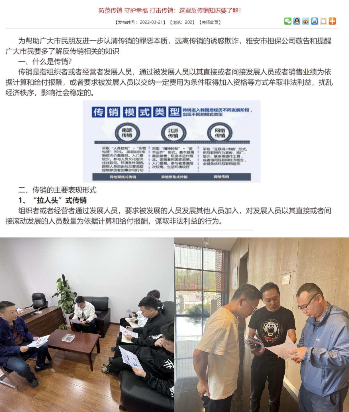 在打擊傳銷“宣傳教育周”活動(dòng)中,市擔(dān)保公司一方面通過官網(wǎng)、微信群、分組學(xué)習(xí)等方式,積極向員工宣傳打擊傳銷知識(shí);另一方面利用外出辦理業(yè)務(wù)的機(jī)會(huì),廣泛地向公司客戶宣傳禁止傳銷的法律法規(guī)。實(shí)現(xiàn)了多渠道、多層面、多角度、多形式開展宣傳警示活動(dòng),揭露傳銷行為的欺騙本質(zhì)和危害性,增強(qiáng)干部職工及客戶辨識(shí)、防范傳銷能力,提高自我防護(hù)意識(shí),營造全社會(huì)共同參與打擊傳銷的氛圍,維護(hù)社會(huì)和諧穩(wěn)定,為我市經(jīng)濟(jì)社會(huì)全面協(xié)調(diào)發(fā)展服務(wù)。