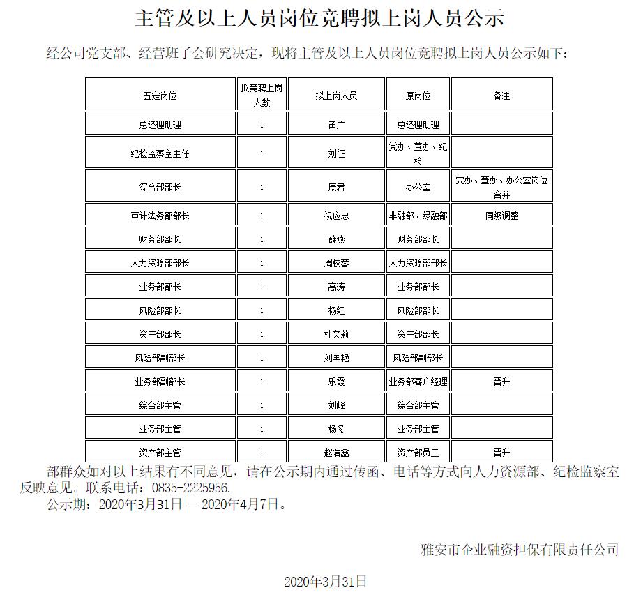 主管及以上人員崗位競聘擬上崗人員公示